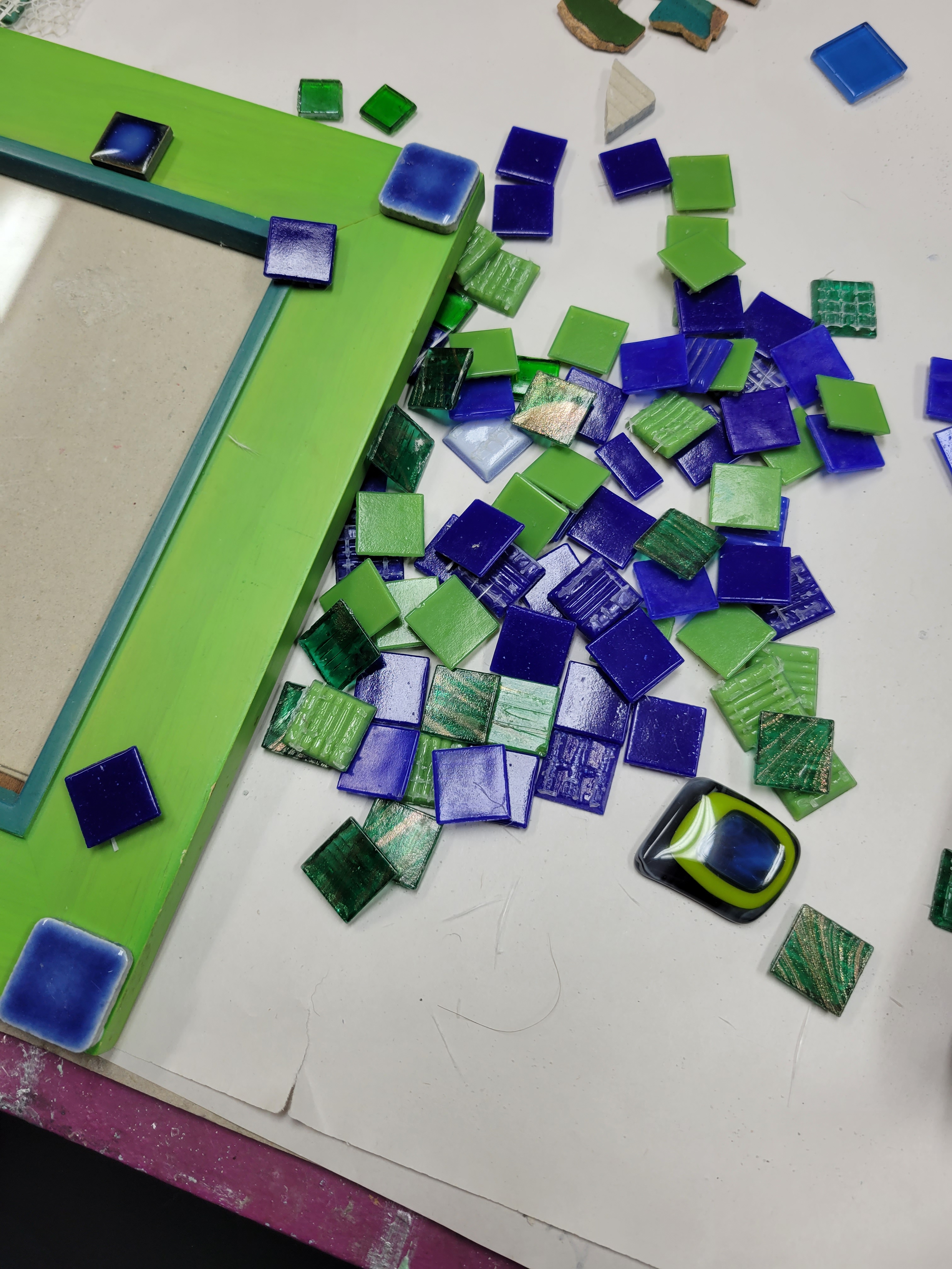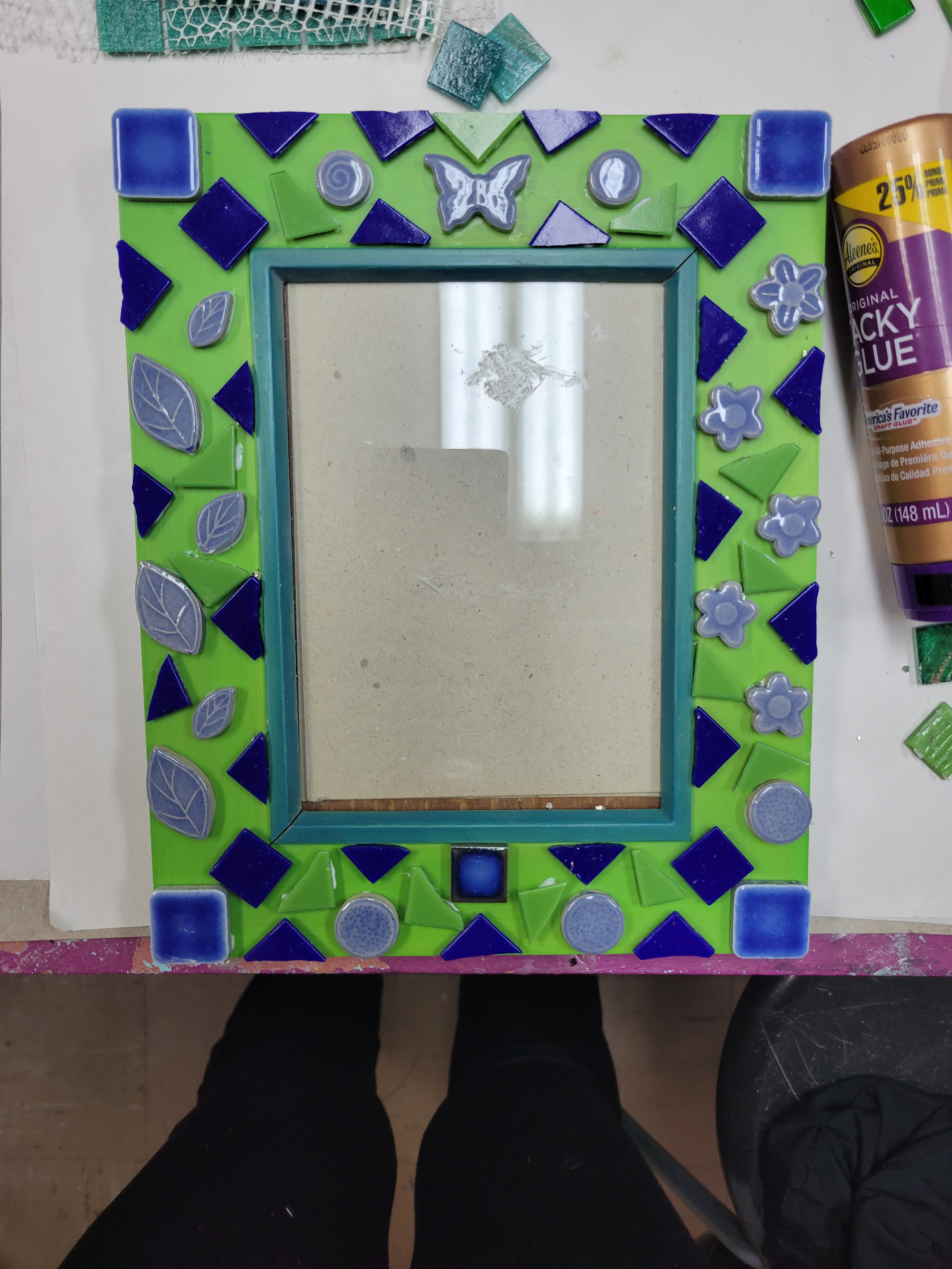 While I was waiting for my latest piece (a bird) to dry, I decided to do a picture frame.  It was going to be a gift for my brother, but then came the flowers and the butterfly. And instead of grout I used glitter, tons of glitter.  It is hard to see the glitter in the picture.  It is no longer for my brother 🙂