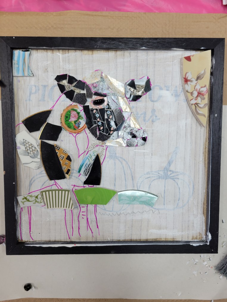 A cow in love… with blue flowers