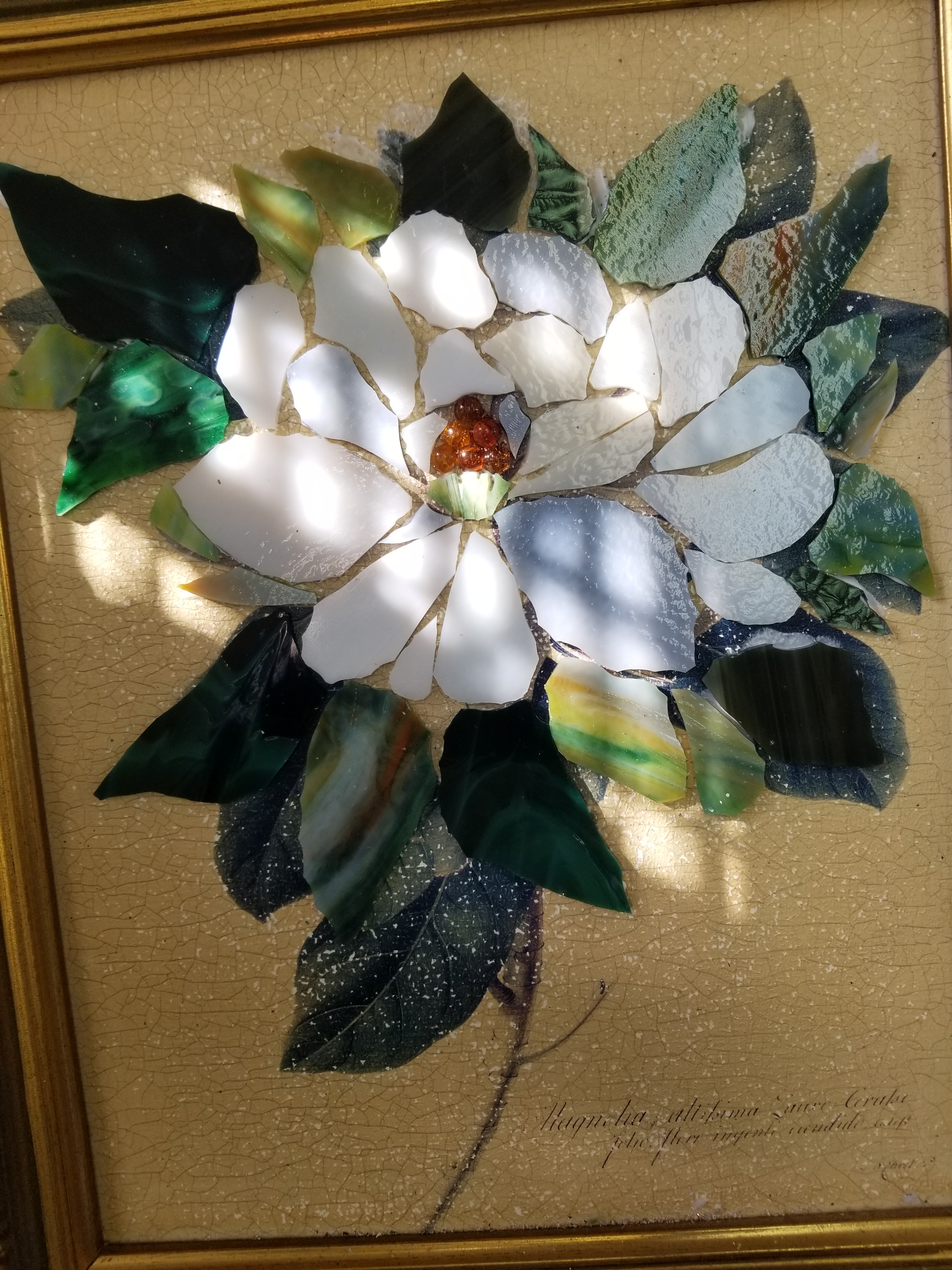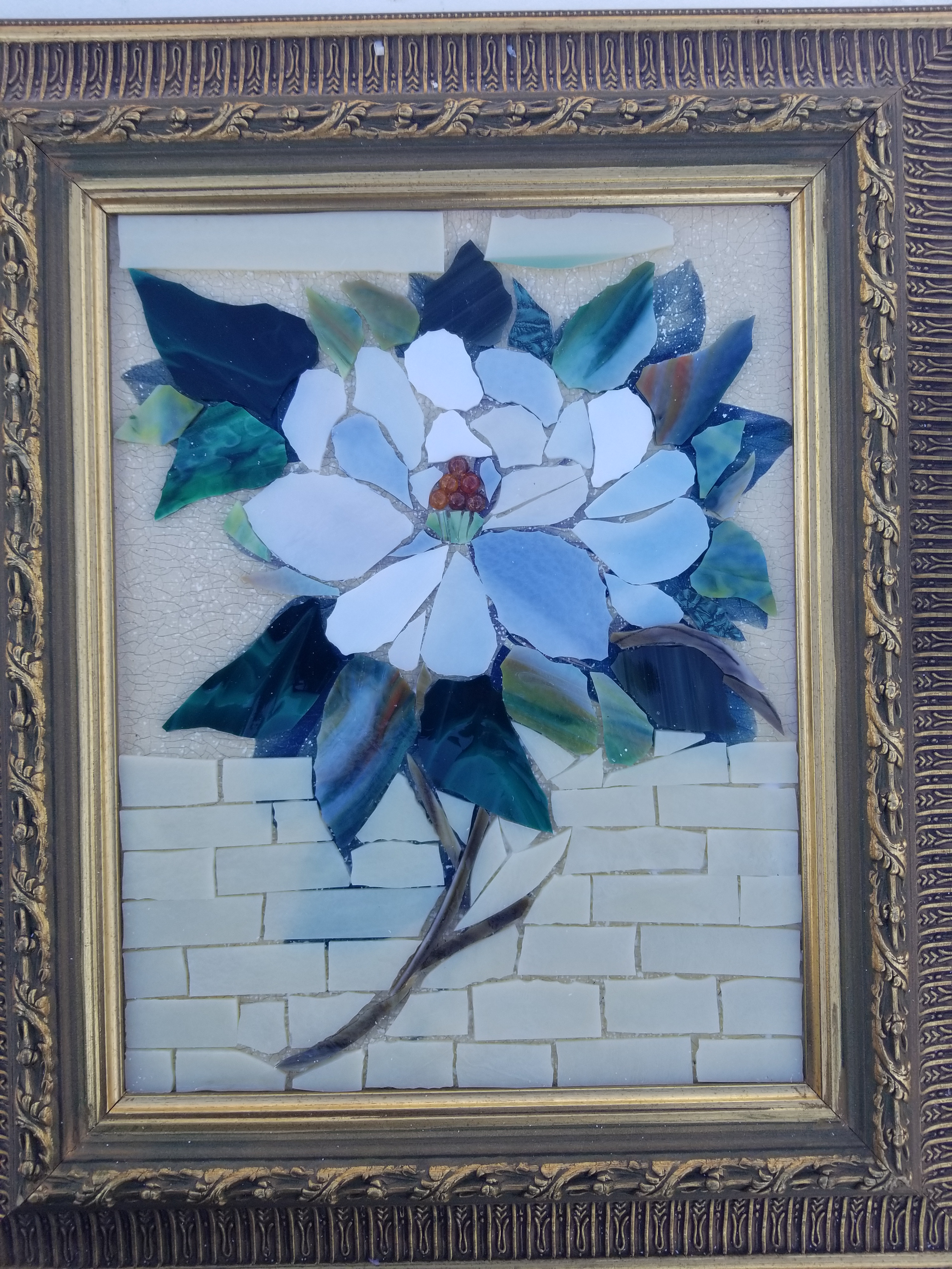The piece below was done at the studio about a month ago.  A friend was throwing out 3 old paintings and offered them to me to use the frames.  I thought they would be perfect to make mosaic on.  I used one for my mother’s gift. The second is below and the third one is still in my mind.
