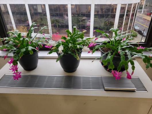 The Christmas cactuses are blooming. The plants in my office continue to thrive. The picture below is from the beginning of the week. Today they look even better and by next week all the buds will probably be in bloom. I will take another picture them.