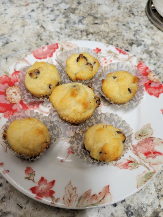 She makes a bunch of different items throughout the months and always saves us a sample. My only complaint, if I can’t be that ungrateful, is that I was eager to have the scones, but she decided to flavor them this time with ginger. It was too strong for me. But there were plenty of other goodies for me to try, such as the mini chocolate chip muffins below.