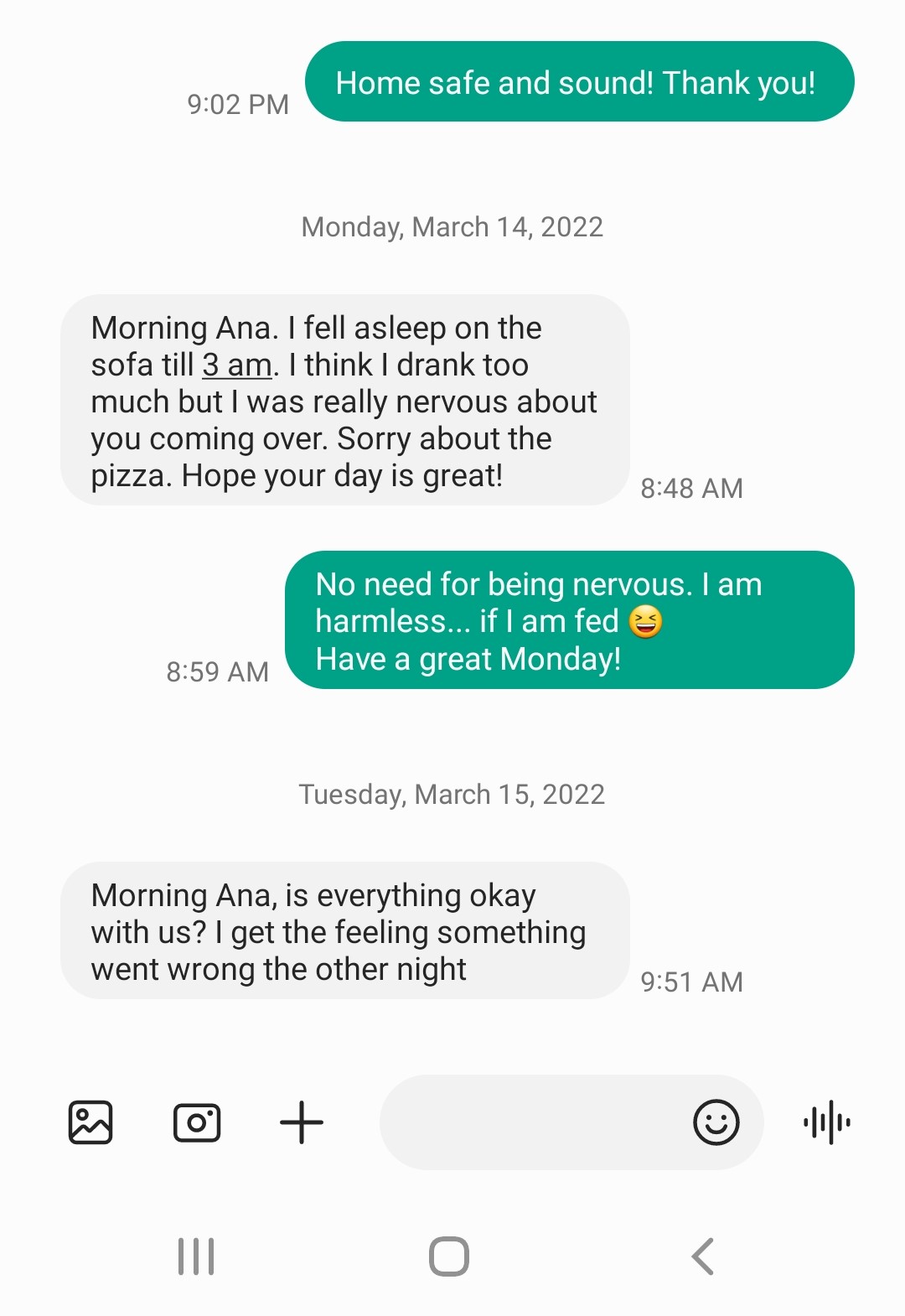 I did have a great time and it is a shame that the night ended in such a way. It could have been different if I had asked for something to eat, or told him to get the pizza going faster. I didn’t think of it until he mentioned was already 8pm.