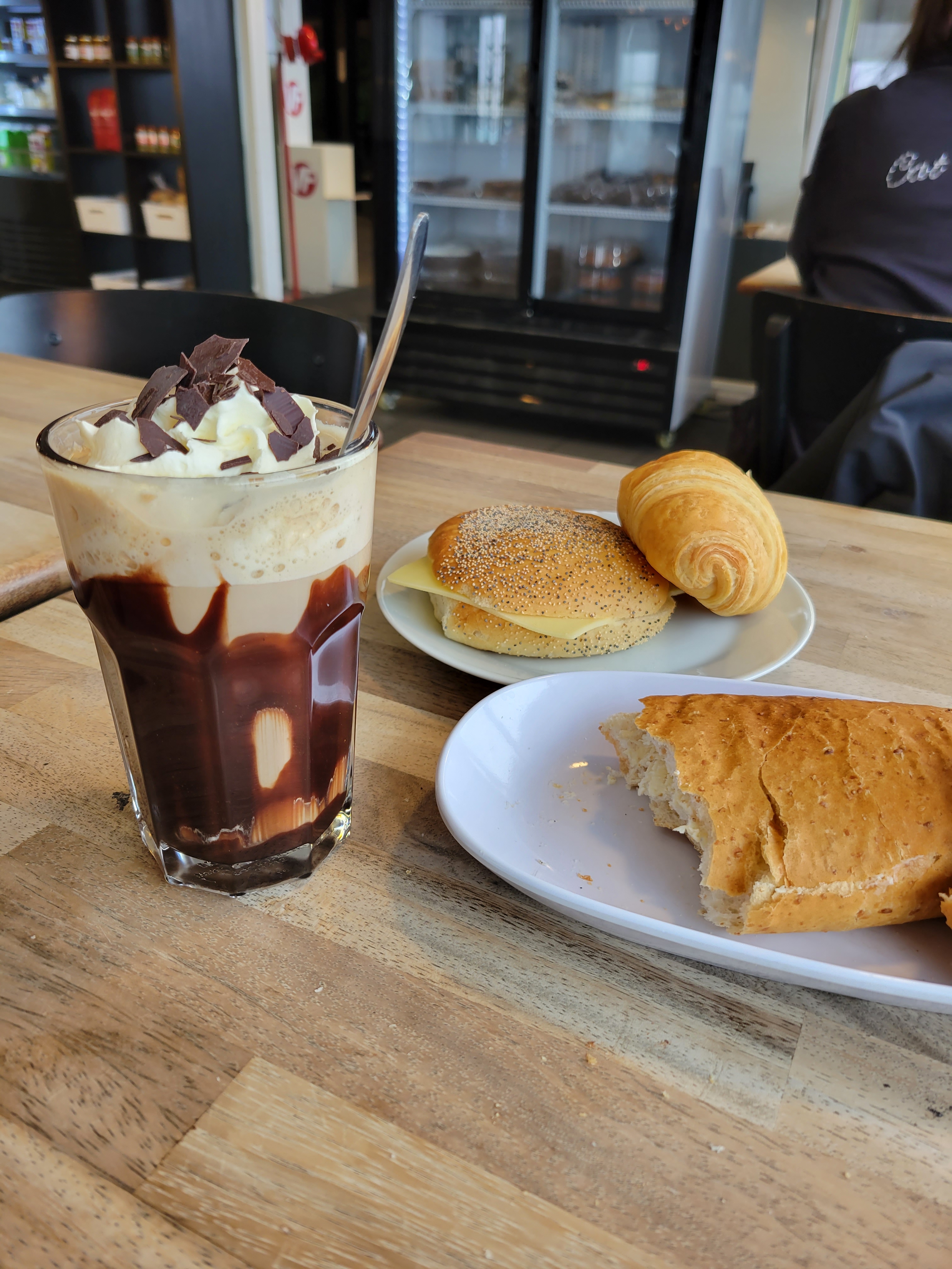 We stopped at a gas station to get gas, and made it to the airport with a lot time to spare. We checked in, and then got breakfast. There was not a lot to choose from, so we got croissants and coffee.