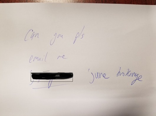Today I walked in and there was a note on my desk (pictured at the top).  I blocked the client’s name on it.  It is childish of him to avoid speaking to me, but it is so expected. It would have been classier and more gentlemanly  if that was a note of apology but I don’t believe he ever said “I am sorry” in all his life.  I am sure that writing “pls” almost killed him.